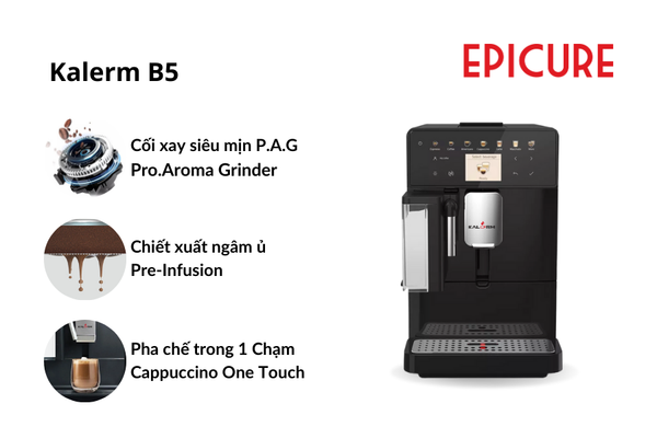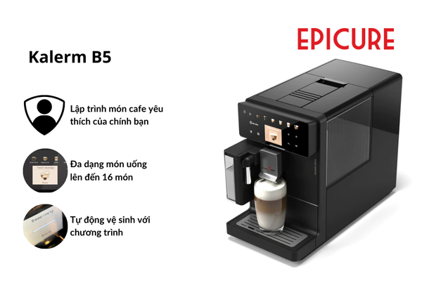 Kalerm B5 là một máy pha cà phê espresso bán tự động, được thiết kế để đáp ứng nhu cầu của những người yêu cà phê tại nhà.Thiết kế nhỏ gọn, đơn giản và mạnh mẽ với máy bơm 15 Bar của Ý, máy pha cafe Kalerm B5 là tuyệt tác của sự hiện đại và tinh tế. Có đến 16 món uống được lập trình sẵn sàng trong máy, và bạn chỉ việc chạm nhẹ vào màn bảng điều khiển cảm ứng, Kalerm B5 sẽ nhanh chóng xay, nén, chiết xuất cafe từ hạt đến tách trong vòng 1 phút.