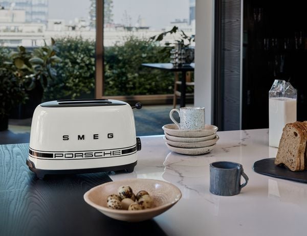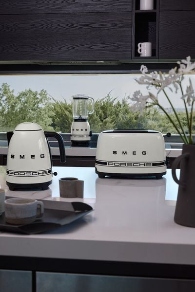 Máy nướng bánh mì Porsche x SMEG kết hợp thiết kế biểu tượng và chức năng. Lấy cảm hứng từ phong cách thập niên 50, máy nổi bật với đường sọc Porsche đặc trưng trên thân máy và các chi tiết tinh tế như điểm nhấn màu đen mờ. Giao diện được thiết kế riêng — với núm điều khiển được đánh số và các nút chức năng chuyên dụng — mang đến nét đặc trưng và thể thao.