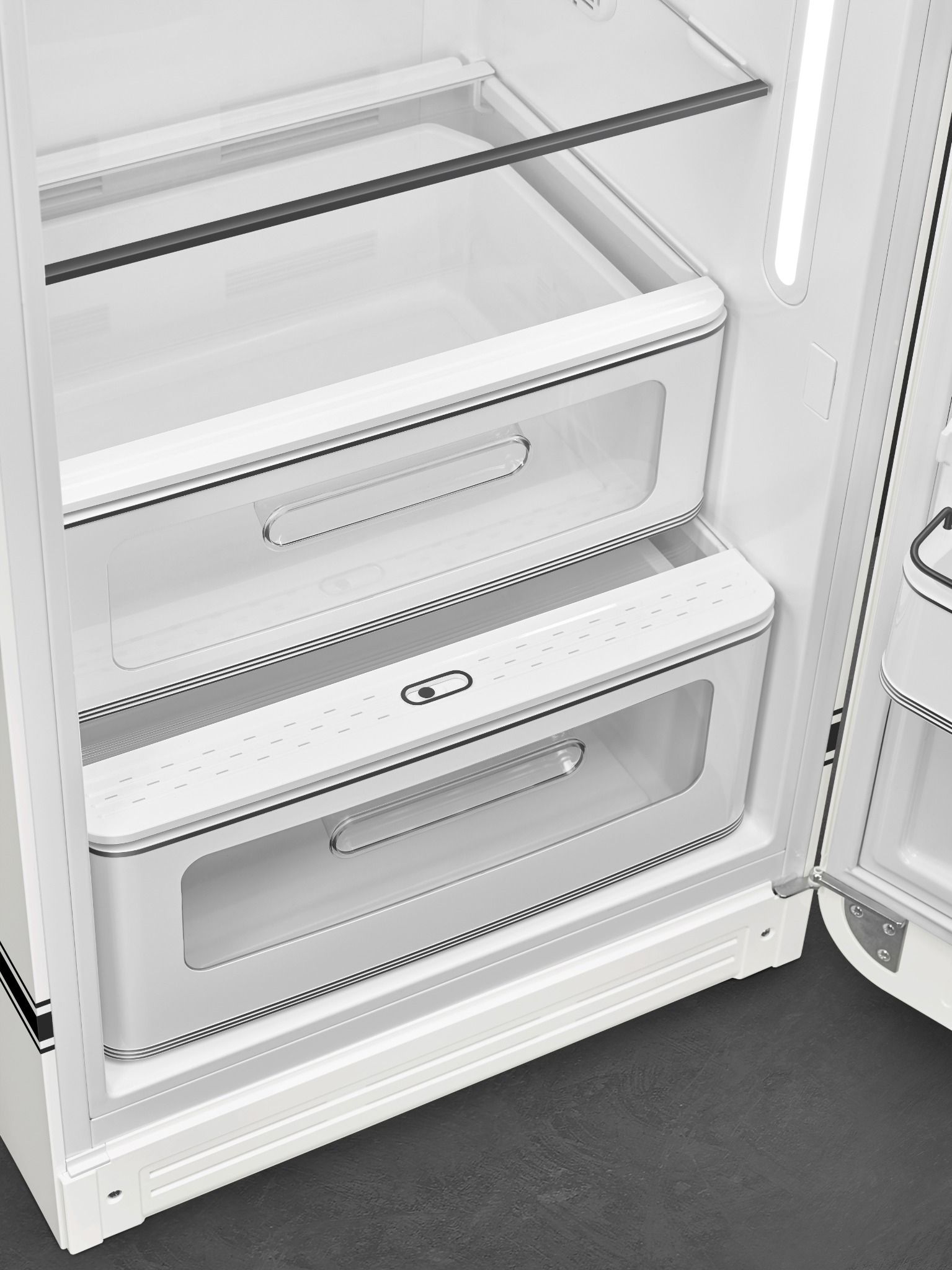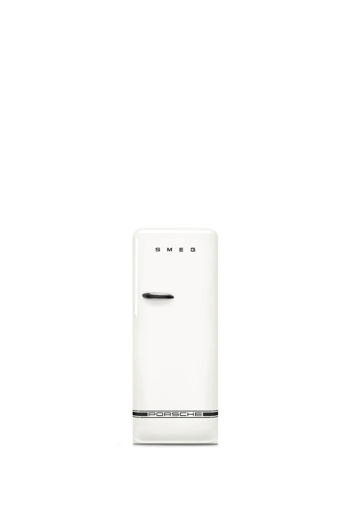 Tủ lạnh Porsche x SMEG màu trắng Carrara là tủ lạnh 270 lít với ngăn đá 26 lít. Chiếc tủ lạnh biểu tượng của Smeg được tùy chỉnh với các chi tiết Porsche. Sản phẩm có thiết kế cửa và tay nắm đặc biệt, mô phỏng theo Porsche 911 GT3 RS. Thiết kế tay nắm được cân đối tỉ mỉ với kích thước tủ lạnh để đảm bảo tính thẩm mỹ hài hòa. Ngoài ra, sản phẩm còn được sơn màu trắng Carrara biểu tượng, với đường sọc Porsche chạy dọc cửa và hai bên thân tủ.
